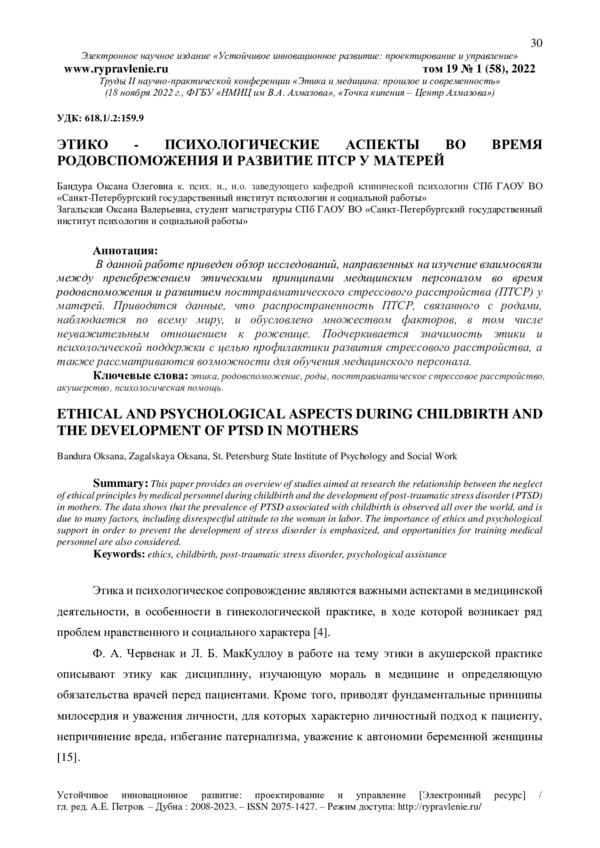 В данной работе приведен обзор исследований, направленных на изучение взаимосвязи между пренебрежением этическими принципами медицинским персоналом во время родовспоможения и развитием посттравматического стрессового расстройства (ПТСР) у матерей. Приводятся данные, что распространенность ПТСР, связанного с родами, наблюдается по всему миру, и обусловлено множеством факторов, в том числе неуважительным отношением к роженице. Подчеркивается значимость этики и психологической поддержки с целью профилактики развития стрессового расстройства, а также рассматриваются возможности для обучения медицинского персонала.