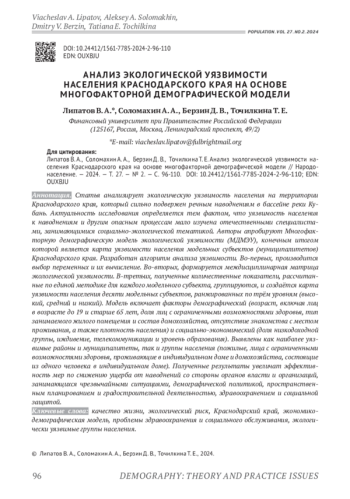 ЛИПАТОВ В. А., СОЛОМАХИН А. А., БЕРЗИН Д. В., ТОЧИЛКИНА Т. Е. АНАЛИЗ ЭКОЛОГИЧЕСКОЙ УЯЗВИМОСТИ НАСЕЛЕНИЯ КРАСНОДАРСКОГО КРАЯ НА ОСНОВЕ МНОГОФАКТОРНОЙ ДЕМОГРАФИЧЕСКОЙ МОДЕЛИ // НАРОДОНАСЕЛЕНИЕ. 2024. ТОМ 27 № 2