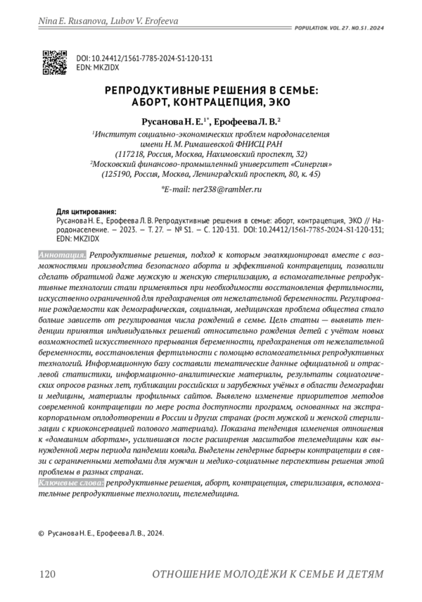 РУСАНОВА Н. Е., ЕРОФЕЕВА Л. В. РЕПРОДУКТИВНЫЕ РЕШЕНИЯ В СЕМЬЕ: АБОРТ, КОНТРАЦЕПЦИЯ, ЭКО // НАРОДОНАСЕЛЕНИЕ. 2024. ТОМ 27 № S1