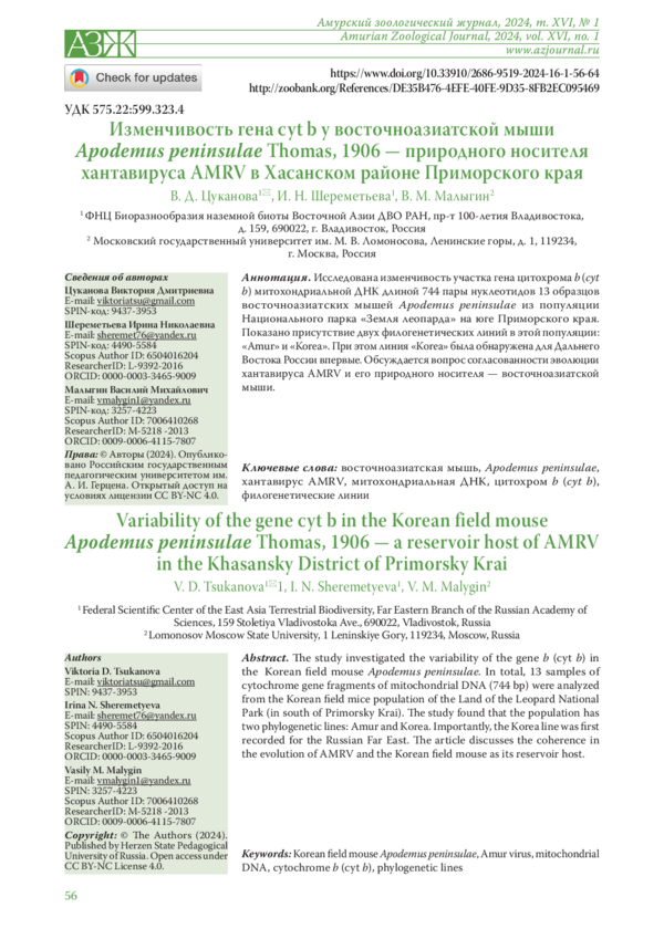 Исследована изменчивость участка гена цитохрома b ( cyt b ) митохондриальной ДНК длиной 744 пары нуклеотидов 13 образцов восточноазиатских мышей Apodemus peninsulae из популяции Национального парка «Земля леопарда» на юге Приморского края.