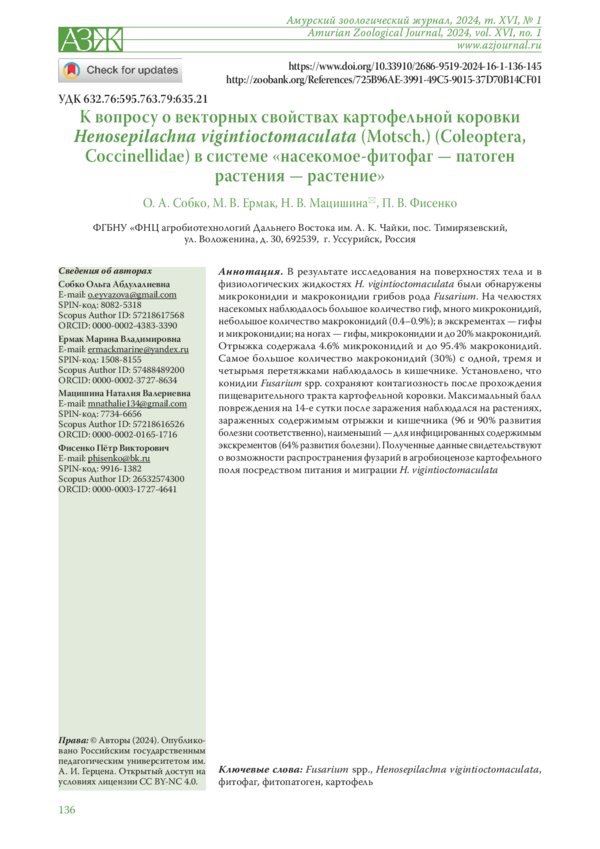 Полученные данные свидетельствуют о возможности распространения фузарий в агробиоценозе картофельного поля посредством питания и миграции H. vigintioctomaculata
