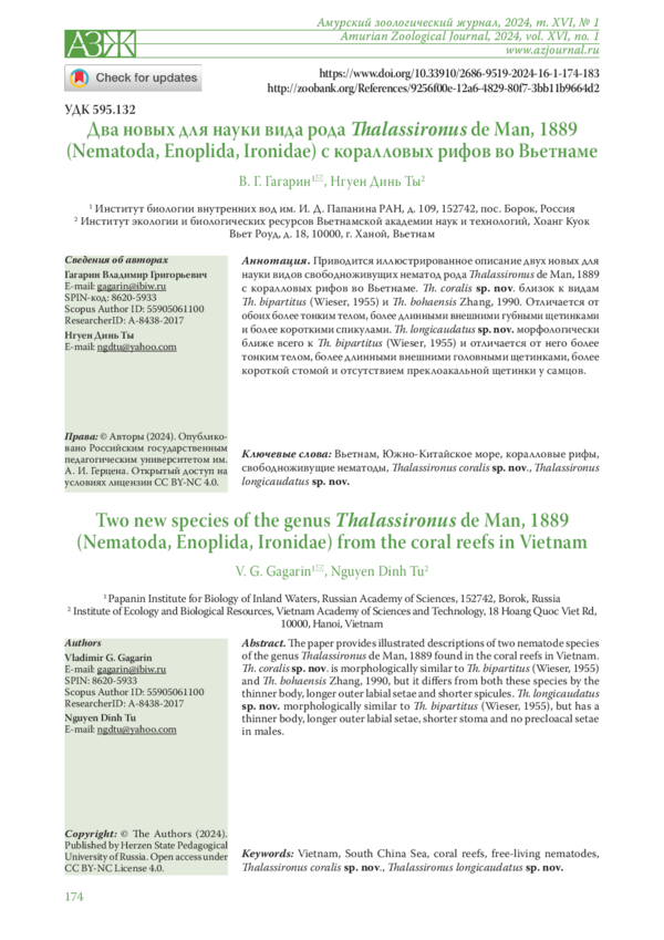Phan, K. L., Nguyen, T. T., Gagarin, V. G., Nguyen, D. T. (2023) Theristus coralis sp. n. and Thalassomonhystera gracilima sp. n. (Nematoda, Monhysterida) from coral reef off the coast of Vietnam. Amurian Zoological Journal, vol. 15, № 2, pp. 401-410. (In English). DOI: 10.33910/2686-9519-2023-15-2-401-410 EDN: BHRWCR