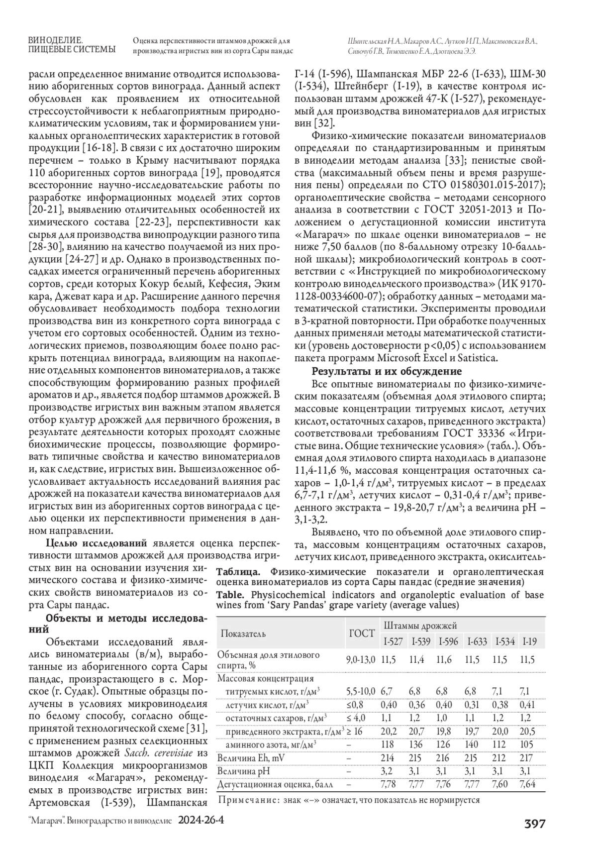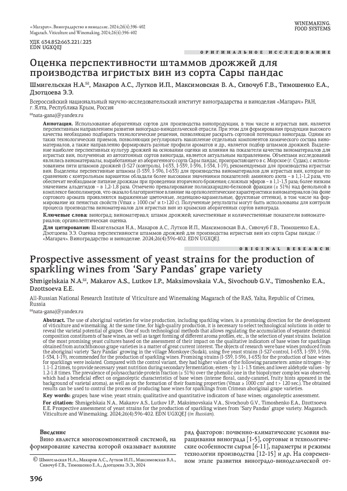 22. Шмигельская Н.А., Макаров А.С., Лутков И.П., Максимовская В.А., Сивочуб Г.В. Оценка физико-химических показателей селекционных и аборигенных сортов виногра- да для производства красных игристых вин. «Магарач». Виноградарство и виноделие. 2024;26(2):154-159.