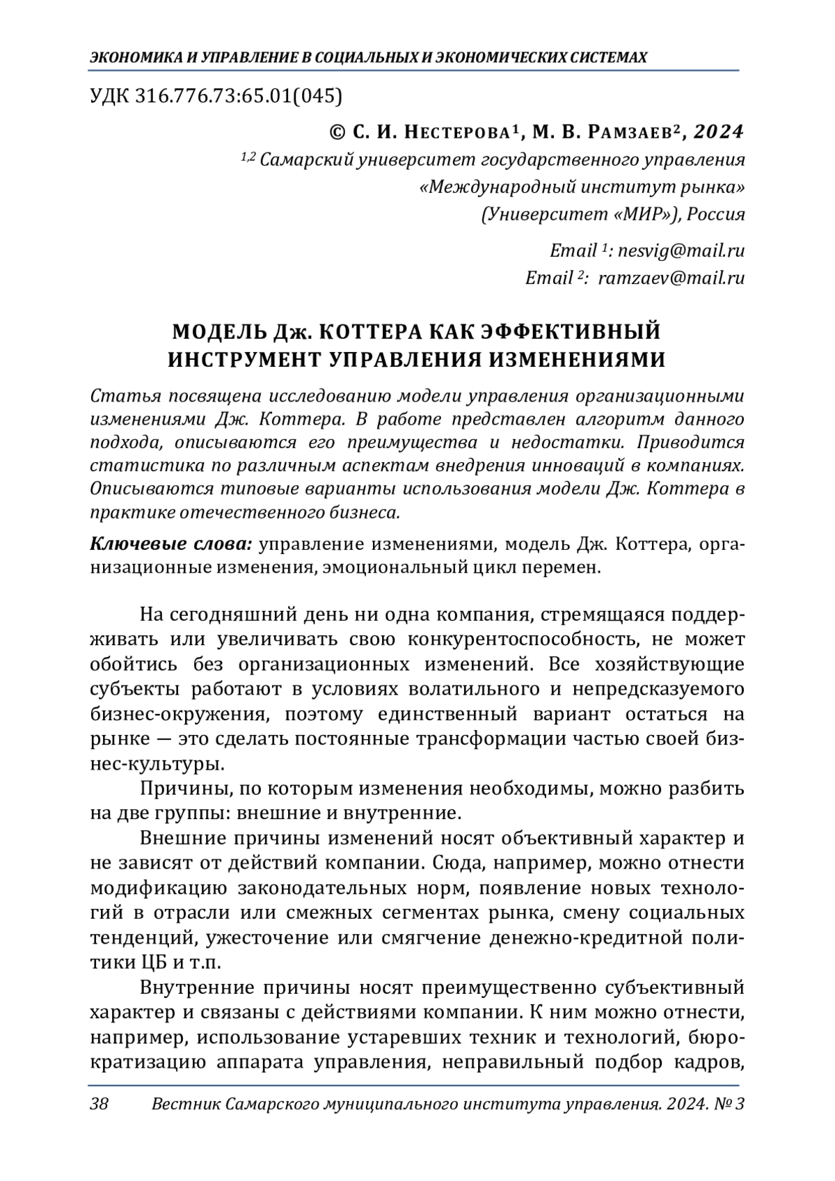 Статья посвящена исследованию модели управления организационными изменениями Дж. Коттера. В работе представлен алгоритм данного подхода, описываются его преимущества и недостатки. Приводится статистика по различным аспектам внедрения инноваций в компаниях. Описываются типовые варианты использования модели Дж. Коттера в практике отечественного бизнеса.