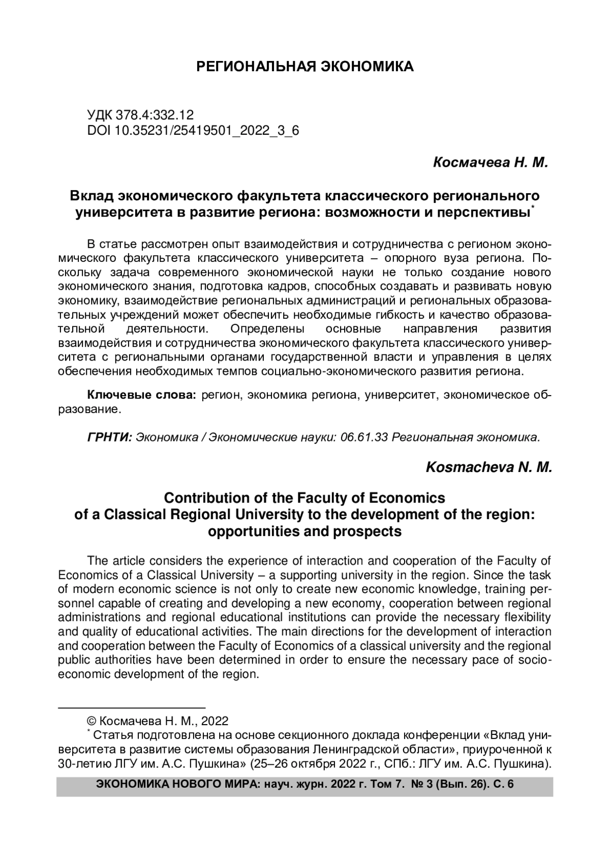 Возможности вузовской науки в современном мире достаточно обширны, а вклад региональных вузов в развитие территорий невозможно переоценить, поскольку именно они в последние 30 лет массово готовят новых работников для местных организаций любого профиля деятельности. Поэтому идея государственной федеральной поддержки именно региональных вузов, в том числе через механизм создания так называемых «опорных» вузов, является важной и даже своевременной, поскольку, как оказалось, не все регионы способны или хотят такую поддержку оказывать в надлежащем размере.