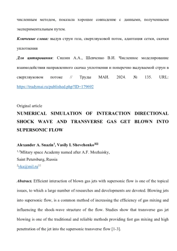 5. Сназин А.А., Шевченко А.В., Панфилов Е.Б., Прилуцкий И.К. Исследование взаимодействия недорасширенной газовой струи, выдуваемой из тела, с высокоскоростным набегающим потоком // Труды МАИ. 2021. № 119. URL: https://trudymai.ru/published.php?ID=159782. DOI: 10.34759/trd-2021-119-05 EDN: GUUXDE