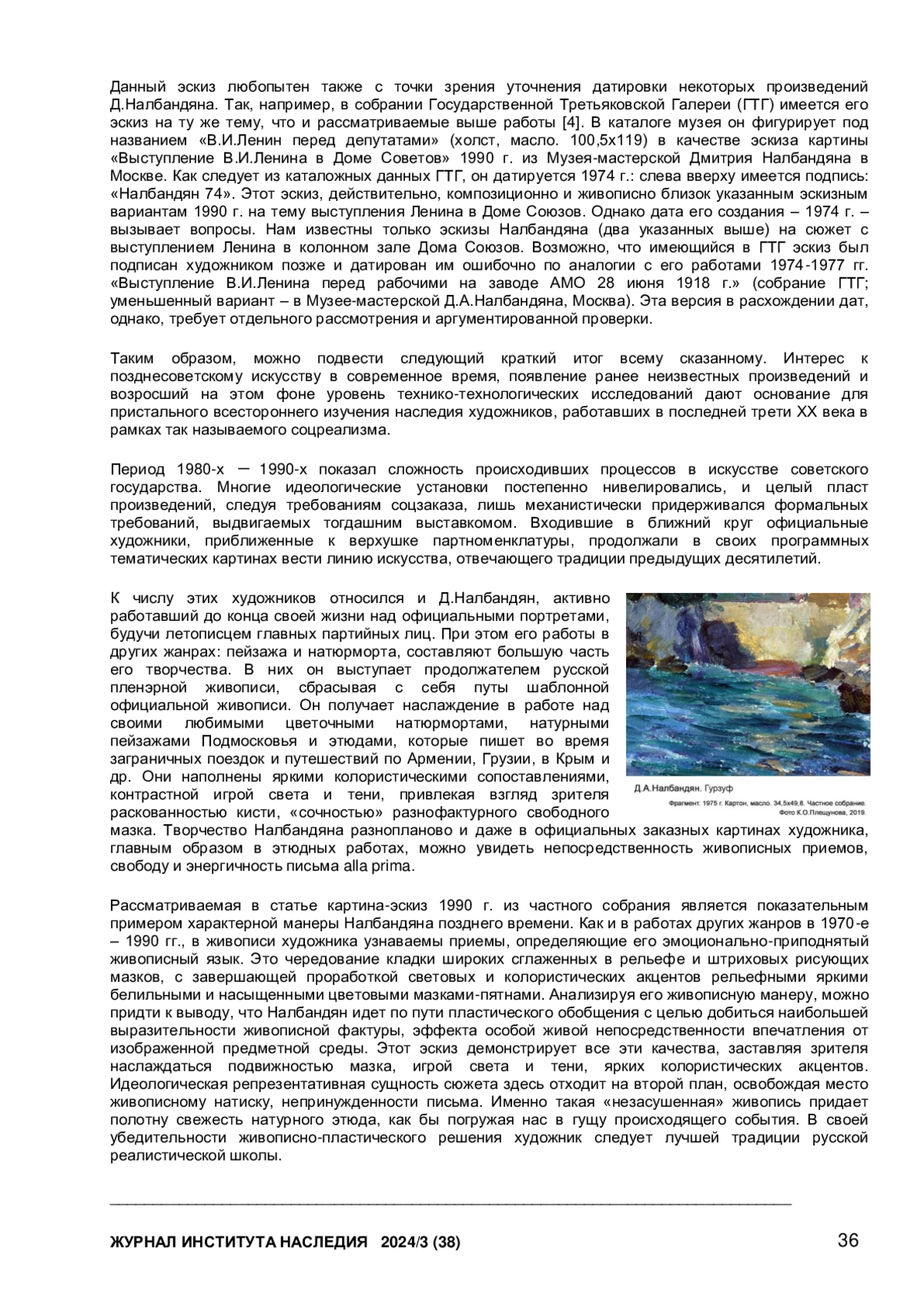 Статья посвящена экспертному исследованию живописного эскиза из частного собрания известного советского художника Д.А.Налбандяна (1906-1993). Этот эскиз под названием «Выступление В.И.Ленина в Доме Союзов» является еще одной подготовительной работой художника, выполненной в 1990 г., наравне с одноименным эскизом из собрания Музея-мастерской Д.А.Налбандяна (Москва). Анализируется художественная манера Налбандяна позднего периода творчества, выделяются основные признаки его живописного почерка. Атрибутированная работа расширяет наше представление о специфике творческого процесса художника этого времени, дополняя ряд его эталонных произведений. В свою очередь материалы проведенного исследования представляются актуальными для изучения позднесоветского искусства в целом.