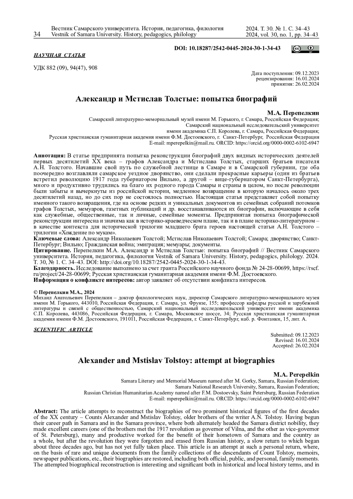 Имена А.Н. Толстого и М.Н. Толстого нельзя причислить к полностью забытым: они нет-нет, да и фигурируют в некоторых биографических исследованиях, посвященных их матери и брату – А.Л. Толстой и А.Н. Толстому [Оклянский 1982, с. 54, 62], можно их встретить в некоторых краеведческих изданиях, посвященных Самаре и самарской истории начала ХХ столетия [Историко-культурная энциклопедия… 1995, с. 89, 97], отсылки к фактам биографии А.Н. и М.Н. Толстых проникли даже на страницы художественных произведений [Толстая 2022, с. 45–47]. Однако никакой полной биографии сыновей одной самарской писательницы и братьев другого – выдающегося – самарца как не было, так и нет, а их отдельные факты и события остаются разбросанными и раскиданными по газетным публикациям и разрозненным архивным документам, лишая нас возможности целостного взгляда на две очень интересные личности, сыгравшие заметную роль как в истории Самары, так и в личных историях уже названных самарцев, прямо или косвенно связанных с М.Н. и А.Н. Толстыми на протяжении длительного времени, знавших или стремившихся знать, как складывались их судьбы и что с ними происходило на разных этапах исторического развития страны, в которой они жили и вместе с которой оказывались в самых разных ситуациях и обстоятельствах. Настоящая статья является первой – пробной – попыткой такие биографии создать, для чего мы привлекли архивы, публикации в газетах и других изданиях, мемуары и некоторые другие источники, одни из которых дополняют другие или друг другу противоречат, но в итоге складываются в нечто, что может быть названо опытом реконструкции биографий А.Н. и М.Н. Толстых.