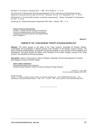 [7] В дополнение к указанным выше публикациям следует отметить следующие работы, определившие такое понимание: Трубачева М. С. Научно-музейная деятельность свящ. Павла Флоренского в Комиссии по охране памятников искусства и старины Троице–Сергиевой Лавры: 1918–1920 // Музей: Худож. собр. СССР. [Сб.] 5 / [Сост. Л. М. Срибнис]. – Москва: Сов. художник, 1984. – C. 152–164; Галинская И. Л. Павел Флоренский об идее «живого музея» // Новая литература по культурологии: Дайджест. – Москва, 1995. – № 3. – С. 22–29; Шварова М. В. Концепция «живого музея» П. А. Флоренского // П. А. Флоренский и современность: материалы научной конференции, 9-12 октября 2007 г., Калининград. – Калининград: Балт. Фед. ун-т им. И. Канта, 2007. – С. 73–77. EDN WZPEJU; Шляхтина Л. М. Музейные инновации в ретроспективе музееведческих идей // Вопросы музеологии. – 2010. – № 1(1). – С. 44–49. EDN OOATHF; Поляков Т. П., Смирнова Т. В. Музей-заповедник: идеальный проект и реальность истории // Российская провинция: среда, культура, социум. Очерки истории города Сергиева Посада. Конец XVIII–XX век / Рос. ин-т культурологии; отв. ред. Э. А. Шулепова. – Москва: РОССПЭН, 2011. – С. 423–465; Поляков Т. П. Технологии, зоны и объекты «живого музея» в экспозиционном пространстве: генезис, развитие, перспективы // Экспозиционная деятельность музеев в контексте реализации «Стратегии государственной культурной политики на период до 2030 года»: монография / Т.П. Поляков [и др.]. – Москва: Ин-т Наследия, 2021. – С. 113–162.