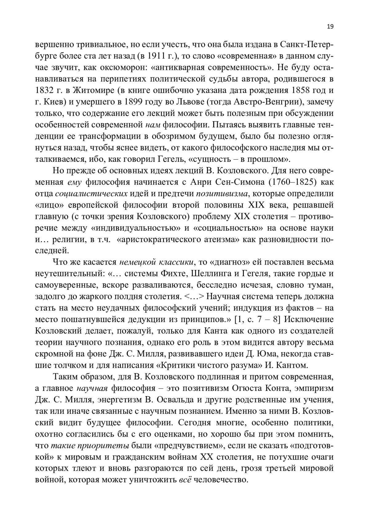 В прошлом году друзья подарили мне книгу «Лекции по современной философии» профессора Владислава Козловского [1], поляка по национальности и духу, родившегося и выросшего в России. Название книги свершенно тривиальное, но если учесть, что она была издана в Санкт-Петербурге более ста лет назад (в 1911 г.), то слово «современная» в данном случае звучит, как оксюморон: «антикварная современность». Не буду останавливаться на перипетиях политической судьбы автора, родившегося в 1832 г. в Житомире (в книге ошибочно указана дата рождения 1858 год и г. Киев) и умершего в 1899 году во Львове (тогда Австро-Венгрии), замечу только, что содержание его лекций может быть полезным при обсуждении особенностей современной нам философии. Пытаясь выявить главные тенденции ее трансформации в обозримом будущем, было бы полезно оглянуться назад, чтобы яснее видеть, от какого философского наследия мы отталкиваемся, ибо, как говорил Гегель, «сущность – в прошлом».