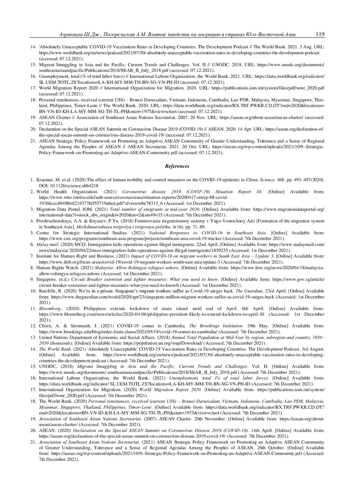 7. Impact of COVID-19 on migrant workers in South East Asia - Update 3 // Institute for Human Right and Business. 2021. URL: https://www.ihrb.org/focus-areas/covid-19/covid-19-migrant-workers-south-east-asia-update-3 (accessed: 07.12.2021).