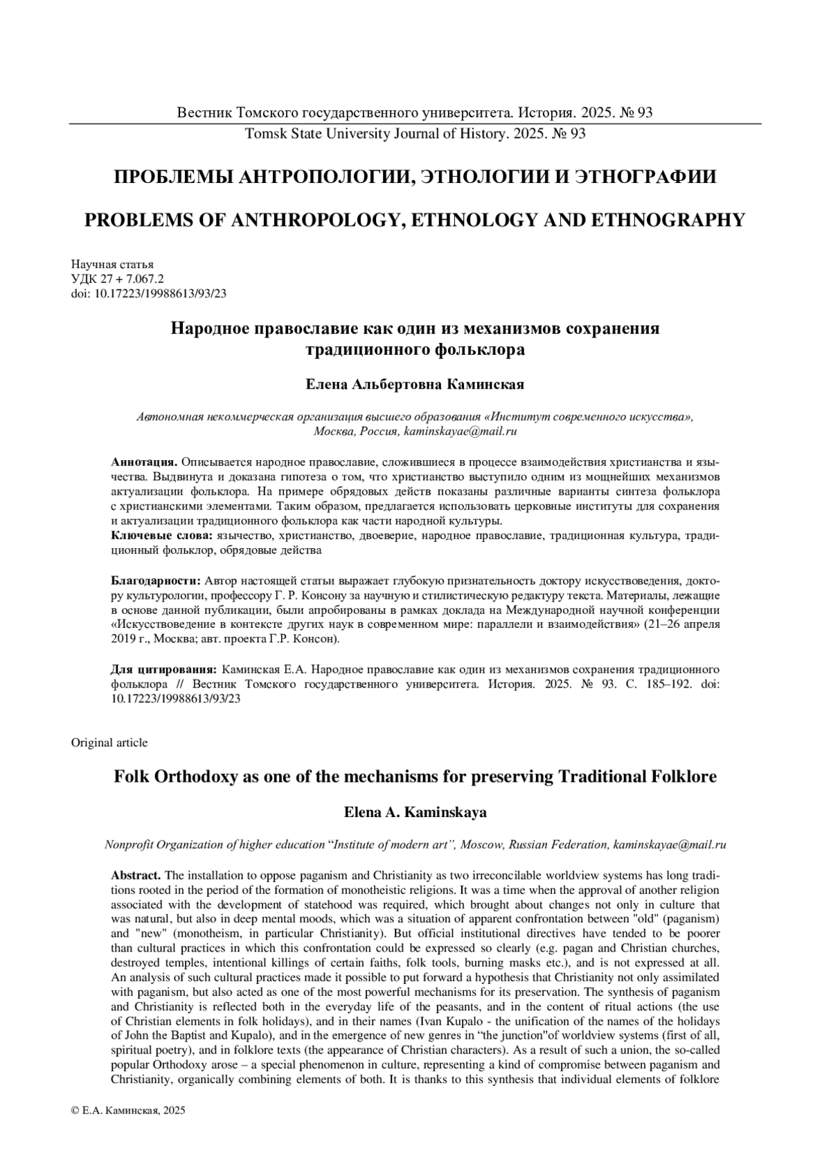 Описывается народное православие, сложившиеся в процессе взаимодействия христианства и язычества. Выдвинута и доказана гипотеза о том, что христианство выступило одним из мощнейших механизмов актуализации фольклора. На примере обрядовых действ показаны различные варианты синтеза фольклора с христианскими элементами. Таким образом, предлагается использовать церковные институты для сохранения и актуализации традиционного фольклора как части народной культуры. Автор настоящей статьи выражает глубокую признательность доктору искусствоведения, доктору культурологии, профессору Г. Р. Консону за научную и стилистическую редактуру текста. Материалы, лежащие в основе данной публикации, были апробированы в рамках доклада на Международной научной конференции «Искусствоведение в контексте других наук в современном мире: параллели и взаимодействия» (21-26 апреля 2019 г., Москва; авт. проекта Г.Р. Консон). Автор заявляет об отсутствии конфликта интересов.