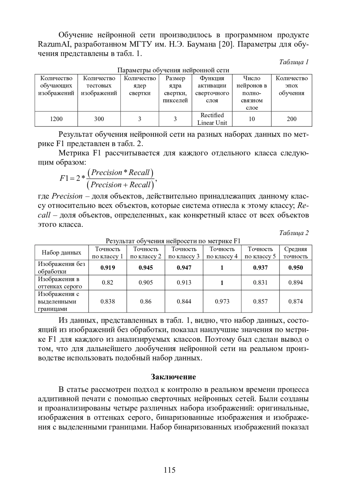 Рассмотрен подход к контролю процесса аддитивной печати с помощью сверточных нейронных сетей. Исследовано влияние набора данных и архитектуры на качество нейронной сети.