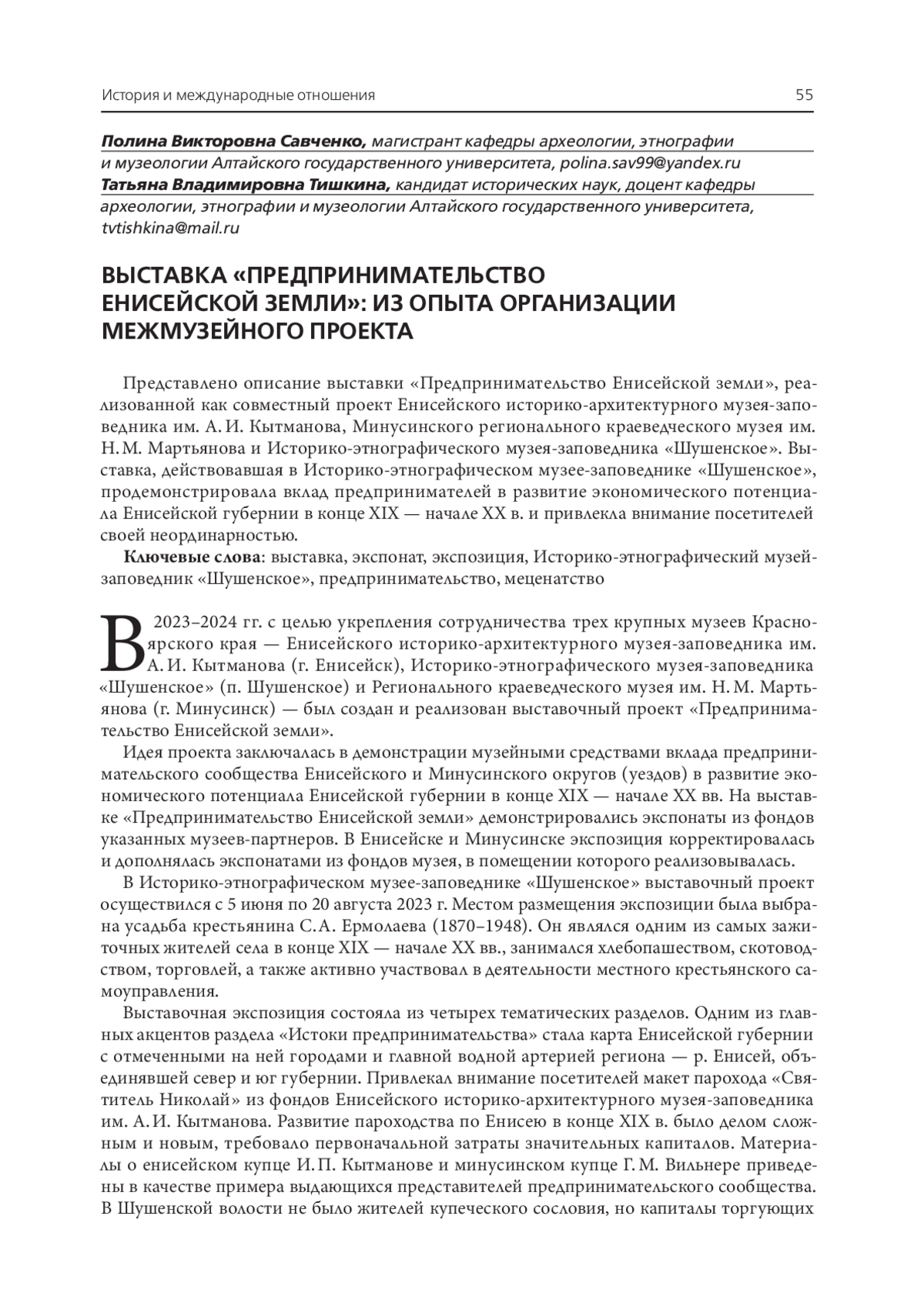 В2023–2024 гг. с целью укрепления сотрудничества трех крупных музеев Красноярского края — Енисейского историко-архитектурного музея-заповедника им. А. И. Кытманова (г. Енисейск), Историко-этнографического музея-заповедника «Шушенское» (п. Шушенское) и Регионального краеведческого музея им. Н. М. Мартьянова (г. Минусинск) — был создан и реализован выставочный проект «Предпринимательство Енисейской земли».