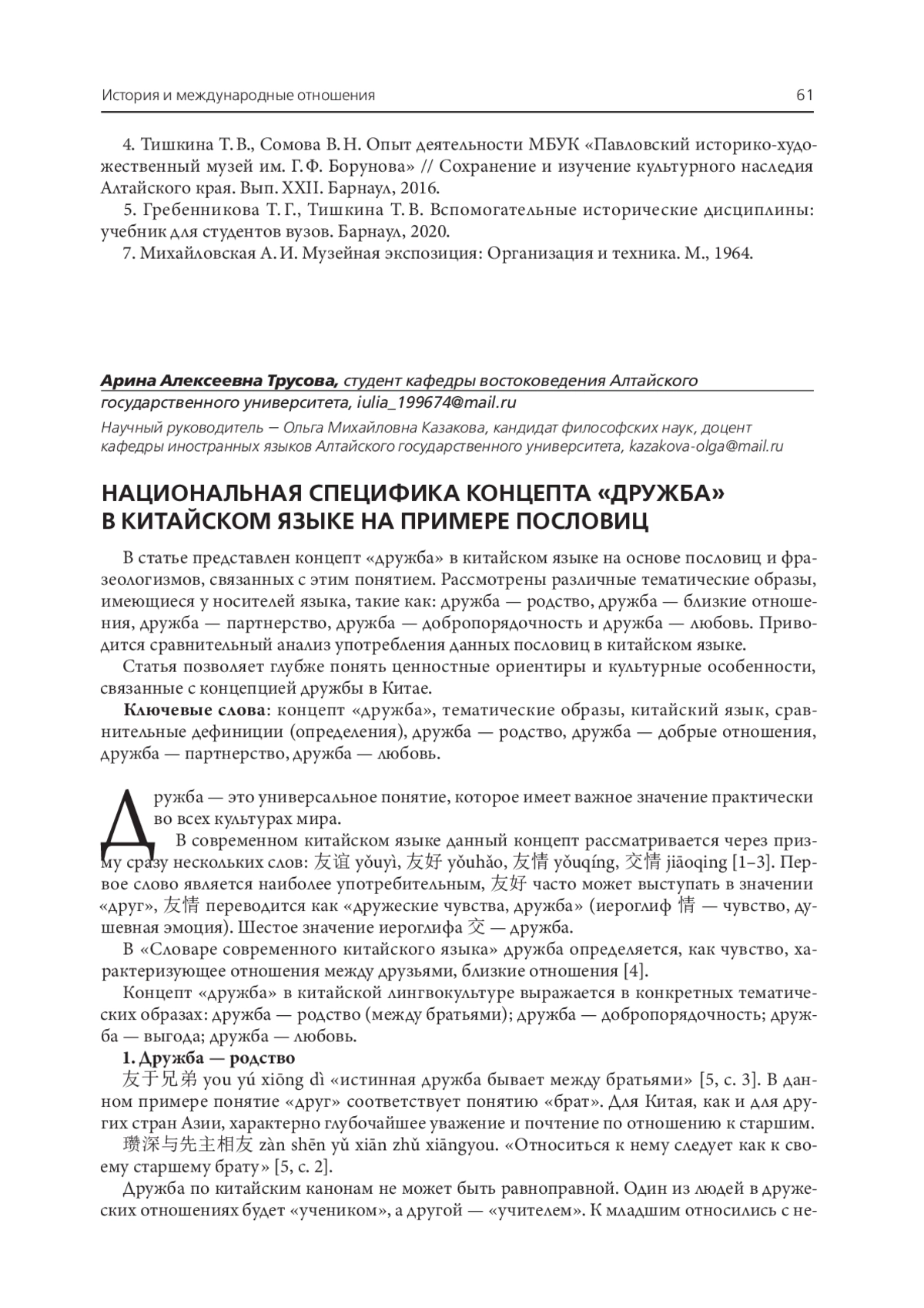 4. Еремкина Е. С. Эволюция концепта “дружба” в китайской лингвокультуре // Постулат. 2017. № 2. EDN: YGDFZV