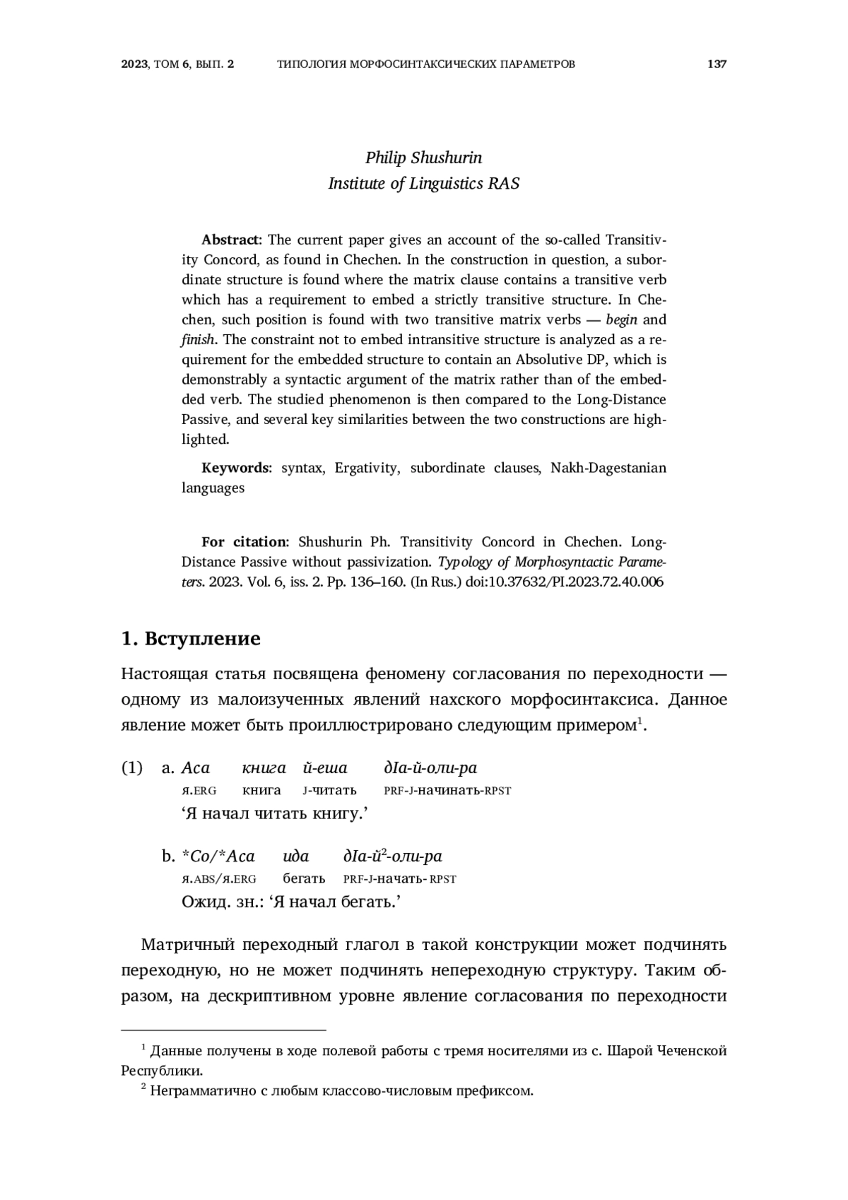 Настоящая статья посвящена феномену согласования по переходности — одному из малоизученных явлений нахского морфосинтаксиса. Данное явление может быть проиллюстрировано следующим примером1.