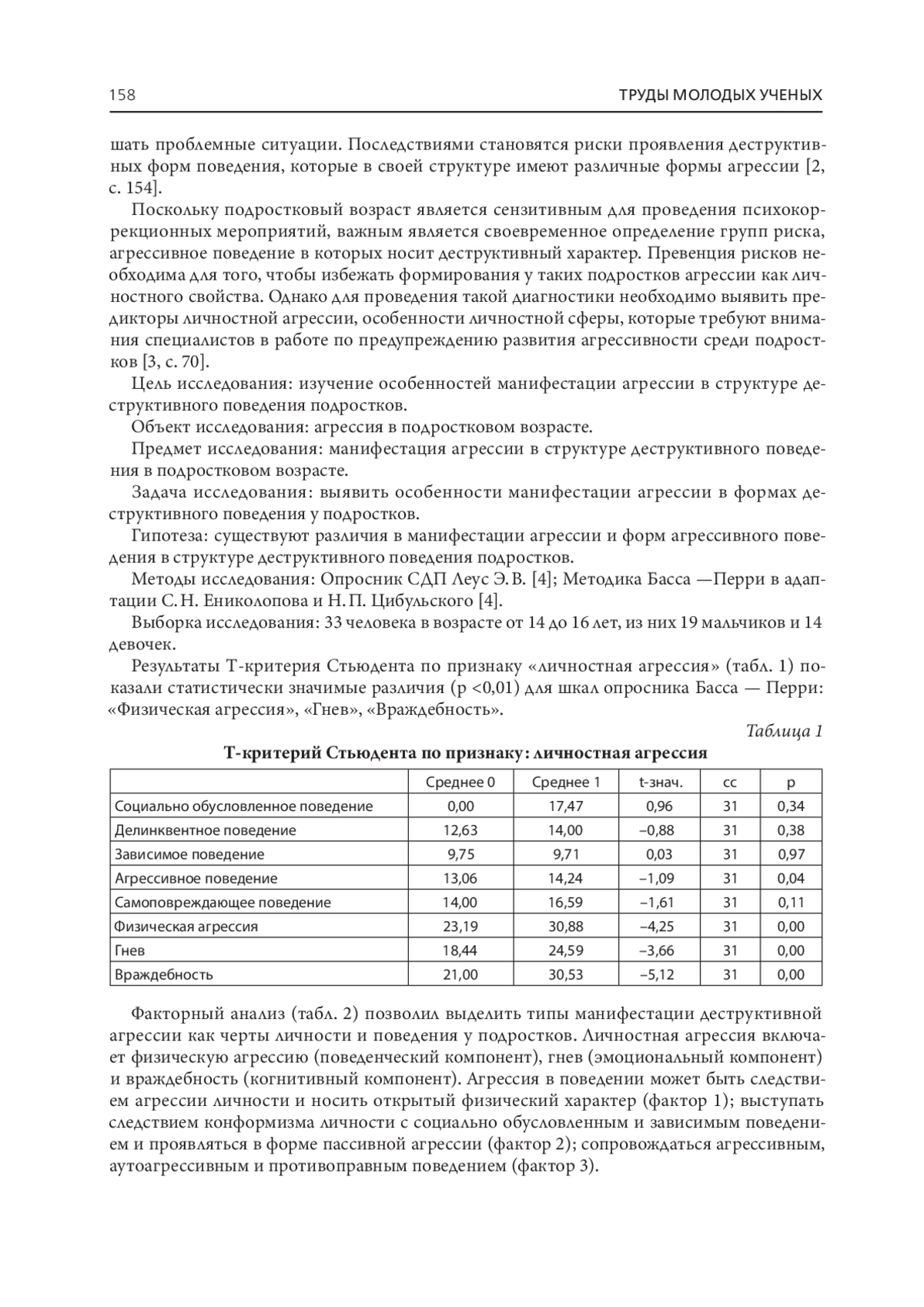 Поскольку подростковый возраст является сензитивным для проведения психокоррекционных мероприятий, важным является своевременное определение групп риска, агрессивное поведение в которых носит деструктивный характер. Превенция рисков необходима для того, чтобы избежать формирования у таких подростков агрессии как личностного свойства. Однако для проведения такой диагностики необходимо выявить предикторы личностной агрессии, особенности личностной сферы, которые требуют внимания специалистов в работе по предупреждению развития агрессивности среди подростков [3, с. 70].