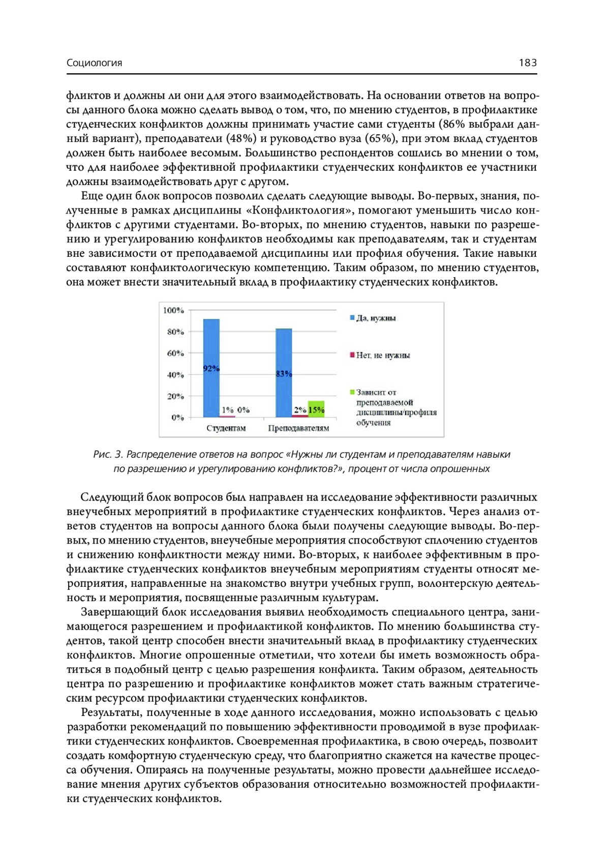Еще один блок вопросов позволил сделать следующие выводы. Во-первых, знания, полученные в рамках дисциплины «Конфликтология», помогают уменьшить число конфликтов с другими студентами. Во-вторых, по мнению студентов, навыки по разрешению и урегулированию конфликтов необходимы как преподавателям, так и студентам вне зависимости от преподаваемой дисциплины или профиля обучения. Такие навыки составляют конфликтологическую компетенцию. Таким образом, по мнению студентов, она может внести значительный вклад в профилактику студенческих конфликтов.