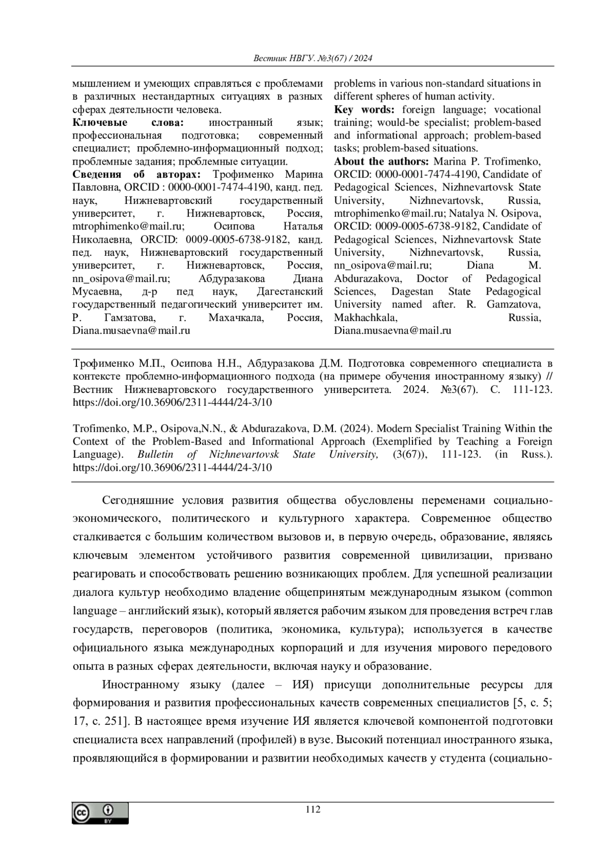 19. Трофименко М.П. Возможности дисциплины “Иностранный язык в профессиональной сфере” в процессе профессиональной подготовки в высших учебных заведениях (на примере уровня магистратуры) // Мир науки. Педагогика и психология. 2017. №1. Т. 5. Идентификационный номер статьи в журнале: 59PDMN117. 0,59 Мб. EDN: YMSJUV
