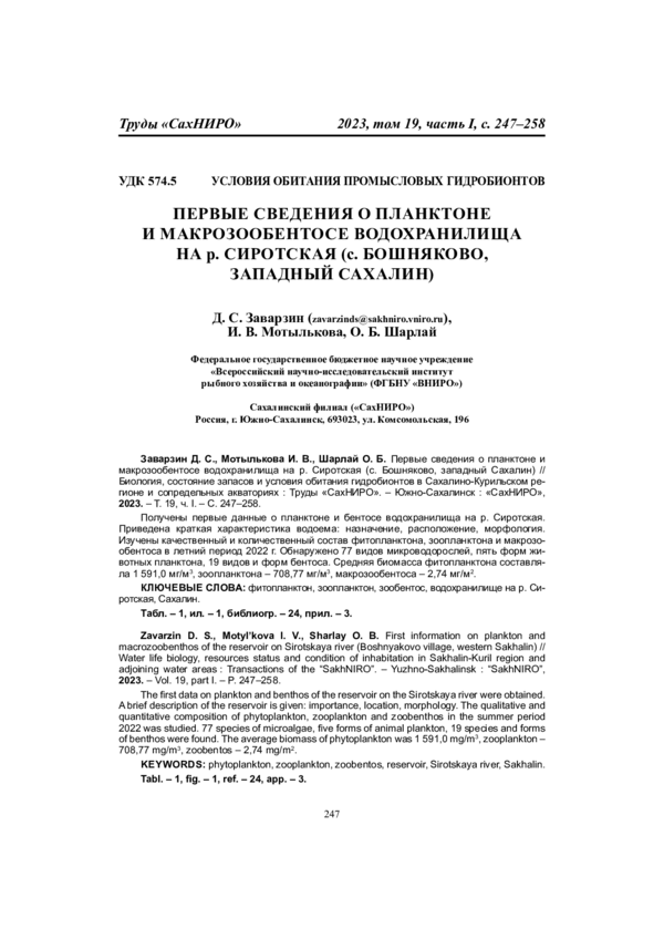 Заварзин Д. С., Лабай В. С., Мотылькова И. В., Корнеев Е. С. Первые сведения о планктоне и макрозообентосе озера Медвежье (г. Оха, северо-восточный Сахалин) в осеннезимний период // Тр. “СахНИРО”. - 2022. - Т. 18. - С. 119-133. EDN: DJIPYB