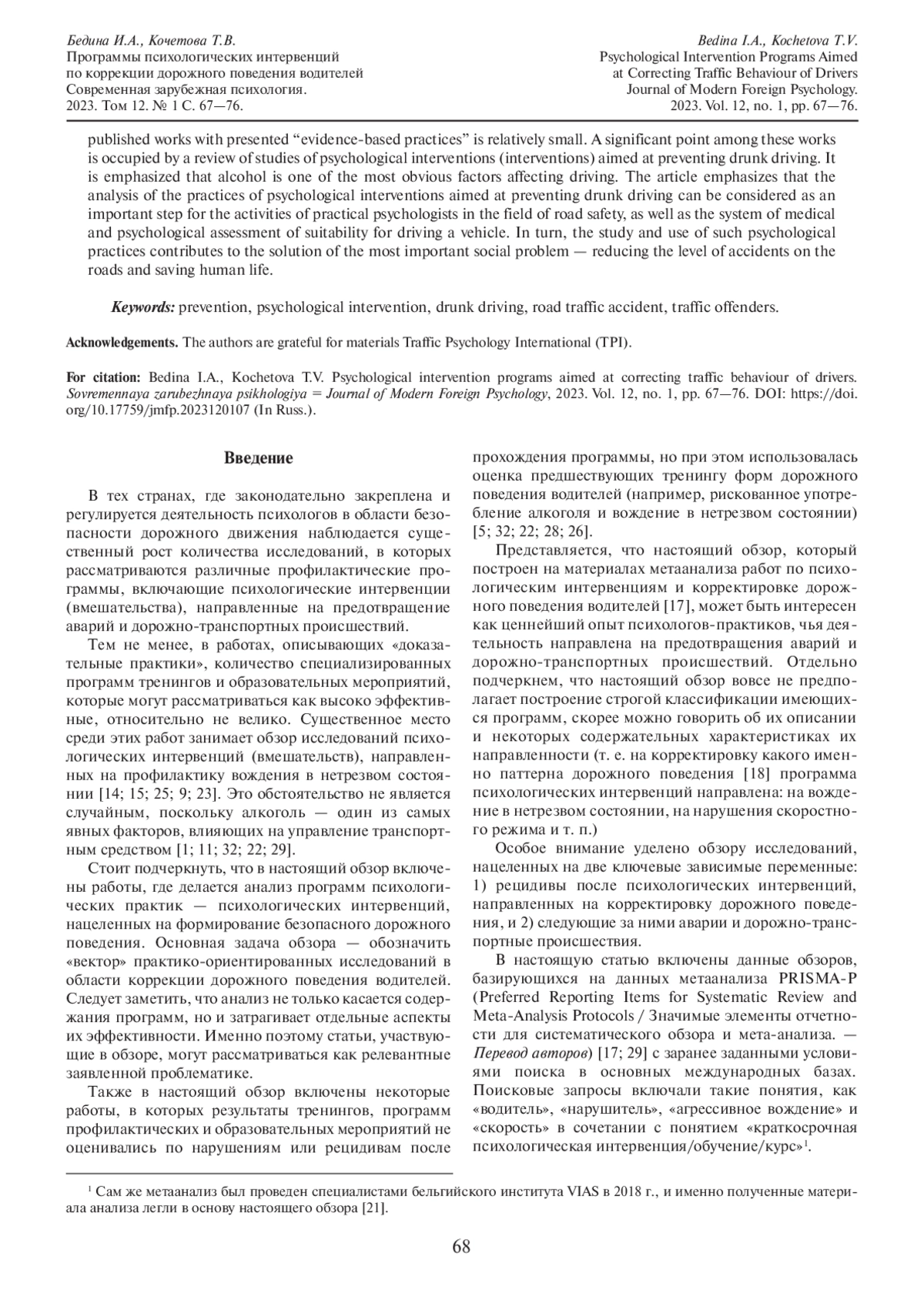 18. Kochetova T.V. The Patterns of Drivers’ Traffic Behavior: Evidence from Three Countries // Frontiers in Psychology. 2022. Vol. 13. Article ID 869029. 4 p. DOI: 10.3389/fpsyg.2022.869029 EDN: ICRQWB