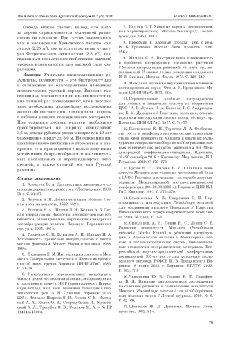 15. Сиволапов, А. И., Левин И. С., Левин С. В. Развитие псевдотсуги Мензиса (Рseudotsuga menziesii (Мirb.) Franco) в условиях интродукции в Воронежской области // Мониторинг лесных и лесомелиоративных систем, инновационные технологии лесоразведения: материалы Всероссийской научно-практической конференции, посвященной 100-летию со дня рождения заслуженного лесовода РСФСР И. В. Трещевского. Воронеж, 8 июня 2023 г. Воронеж: ВГЛТУ, 2023. С. 162-170. EDN: EUTJXW