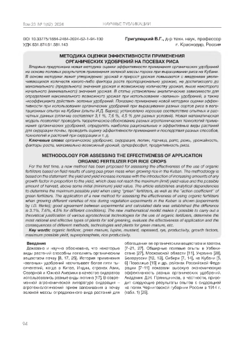Статья: МЕТОДИКА ОЦЕНКИ ЭФФЕКТИВНОСТИ ПРИМЕНЕНИЯ ОРГАНИЧЕСКИХ УДОБРЕНИЙ НА ПОСЕВАХ РИСА (2024)