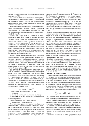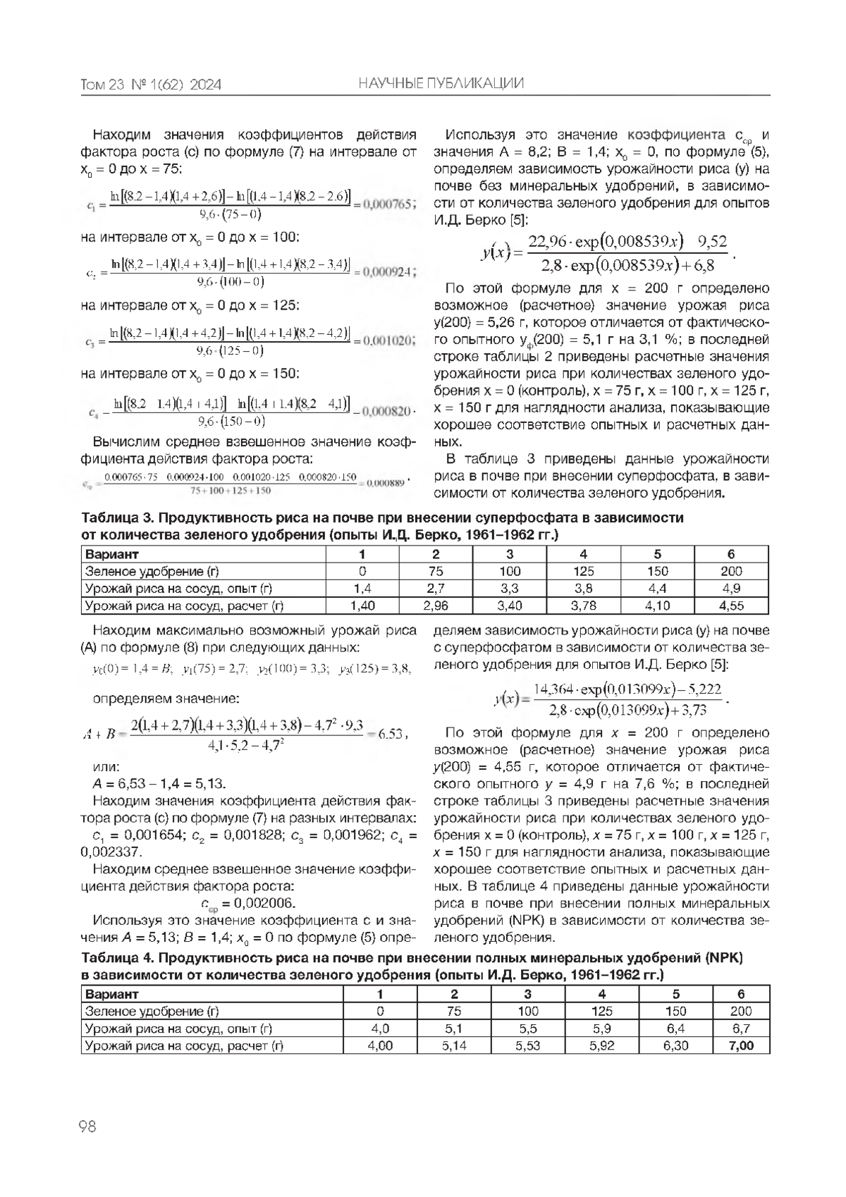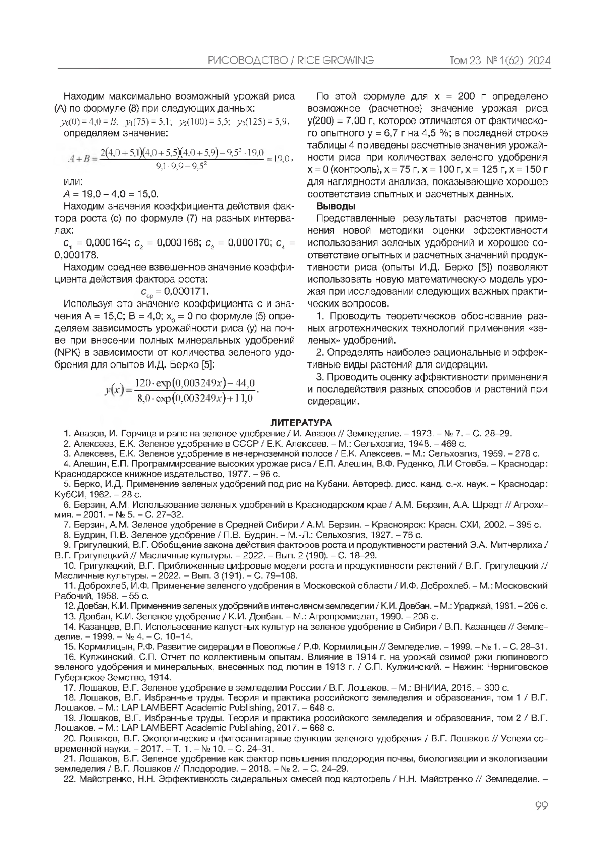 Впервые предложена новая методика оценки эффективности применения органических удобрений на основе полевых результатов применения зеленой массы гороха при выращивании риса на Кубани. В основе методики лежит утверждение: урожай и прирост урожая повышается с введением увеличивающихся количеств какого-либо фактора роста пропорционально урожаю, не достигающего до максимального (предельного) значения урожая и возможному количеству урожая, выше некоторого начального (минимального) значения урожая. В статье установлены аналитические зависимости для определения максимального возможного урожая при использовании «зеленых» удобрений, а также «коэффициента действия» зеленых удобрений. Показано применение новой методики оценки эффективности при использовании органических удобрений при выращивании разных сортов риса в вегетационных опытах на Кубани (опыты И. Д. Берко); установлено хорошее соответствие опытных и расчетных данных (отличие составляет 3,1 %, 7,6 %, 4,5 % для разных условий). Новая математическая модель позволяет проводить теоретическое обоснование разных агротехнических технологий применения органических удобрений, определять наиболее рациональные и эффективные виды растений для сидерации почвы, проводить оценку эффективности применения и последствия разных способов, технологий и растений при сидерации и т. д.