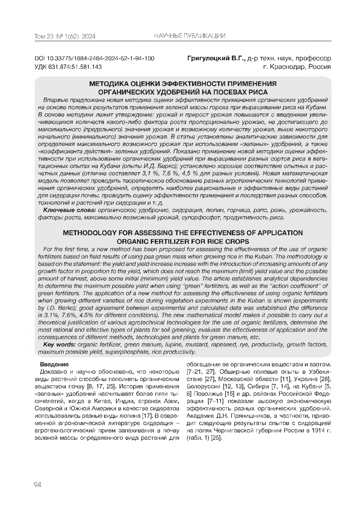 ГРИГУЛЕЦКИЙ В. Г. МЕТОДИКА ОЦЕНКИ ЭФФЕКТИВНОСТИ ПРИМЕНЕНИЯ ОРГАНИЧЕСКИХ УДОБРЕНИЙ НА ПОСЕВАХ РИСА // РИСОВОДСТВО. 2024. Т. 23 №1