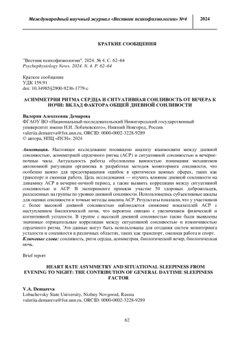 Настоящее исследование посвящено анализу взаимосвязи между дневной сонливостью, асимметрией сердечного ритма (АСР) и ситуативной сонливостью в вечерне-ночные часы. Актуальность работы обусловлена важностью понимания механизмов автономной регуляции организма и разработки методов мониторинга сонливости, что особенно важно для предотвращения ошибок в критически важных сферах, таких как транспорт и сменная работа. Цель исследования — изучить влияние дневной сонливости на динамику АСР в вечерне-ночной период, а также выявить корреляции между ситуативной сонливостью и АСР. В эксперименте приняли участие 50 здоровых добровольцев, разделенных на группы по уровню дневной сонливости. Использовались субъективные шкалы для оценки сонливости и точные методы анализа АСР. Результаты показали, что у участников с более высокой дневной сонливостью наблюдается снижение показателей АСР с наступлением биологической ночи, что вероятно связано с увеличением физической и когнитивной усталости. В группе с высокой дневной сонливостью также были выявлены значимые отрицательные корреляции между ситуативной сонливостью и изменчивостью сердечного ритма. Эти данные могут быть использованы для создания систем мониторинга усталости и сонливости в различных областях, таких как транспорт, сменная работа и спорт.
