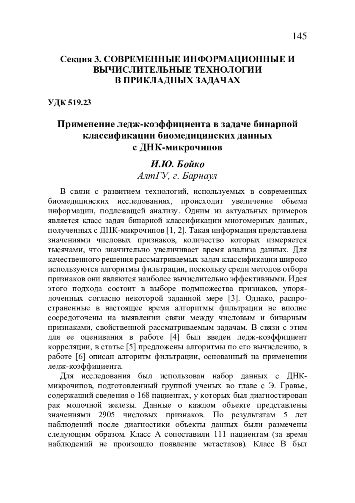 В связи с развитием технологий, используемых в современных биомедицинских исследованиях, происходит увеличение объема информации, подлежащей анализу. Одним из актуальных примеров является класс задач бинарной классификации многомерных данных, полученных с ДНК-микрочипов [1, 2]. Такая информация представлена значениями числовых признаков, количество которых измеряется тысячами, что значительно увеличивает время анализа данных. Для качественного решения рассматриваемых задач классификации широко используются алгоритмы фильтрации, поскольку среди методов отбора признаков они являются наиболее вычислительно эффективными. Идея этого подхода состоит в выборе подмножества признаков, упорядоченных согласно некоторой заданной мере [3]. Однако, распространенные в настоящее время алгоритмы фильтрации не вполне сосредоточены на выявлении связи между числовым и бинарным признаками, свойственной рассматриваемым задачам. В связи с этим для ее оценивания в работе [4] был введен ледж-коэффициент корреляции, в статье [5] предложены алгоритмы по его вычислению, в работе [6] описан алгоритм фильтрации, основанный на применении ледж-коэффициента
