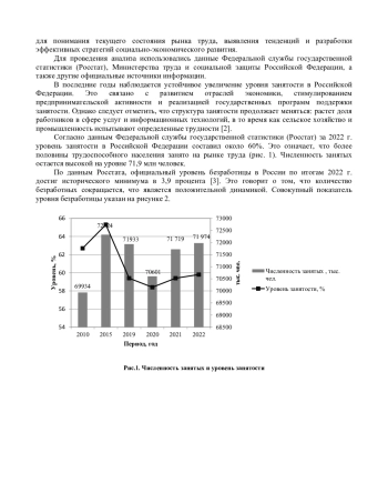 В этой научной работе исследуется проблема занятости и безработицы в Российской Федерации. Авторы анализируют данные Федеральной службы государственной статистики, Министерства труда и социальной защиты и других официальных источников. Они отмечают, что в последние годы наблюдается устойчивый рост уровня занятости и сокращение уровня безработицы. Однако проблема структурной безработицы остаётся актуальной, и рекомендации по её преодолению включают развитие образования и профессиональной подготовки, адаптацию программ обучения к потребностям рынка труда. В данной работе проводится анализ статистики занятости и безработицы в России за 2020–2022 годы. Цель исследования — выявление тенденций и изменений в уровне занятости и безработицы, а также определение факторов, влияющих на эти показатели. В процессе анализа используются современные методы сбора и обработки данных, такие как официальная статистика и отчёты региональных органов управления трудовыми ресурсами. Результаты исследования могут быть полезны для разработки эффективных стратегий управления персоналом и социально-экономического развития регионов России.