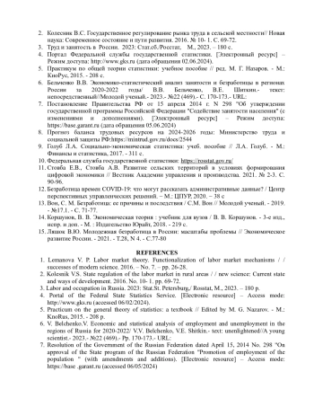 - Бельченко В.В. Экономико-статистический анализ занятости и безработицы в регионах России за 2020-2022 годы/ В.В. Бельченко, В.Е. Шиткин.- текст: непосредственный//Молодой ученый.- 2023.- №22 (469).- С. 170-173.- URL: