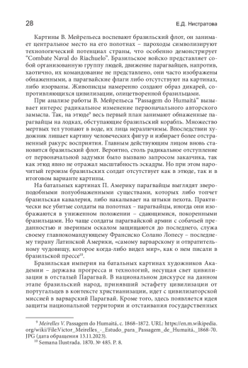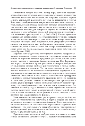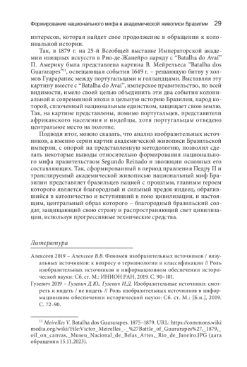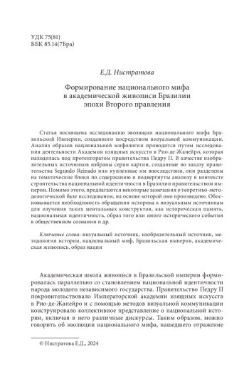 Статья посвящена исследованию эволюции национального мифа Бразильской Империи, созданного посредством визуальной коммуникации. Анализ образов национальной мифологии проводится путем исследования деятельности Академии изящных искусств в Рио-де-Жанейро, которая находилась под протекторатом правительства Педру II. В качестве изобразительных источников избраны серии картин, созданные по заказу правительства Segundo Reinado или купленные им впоследствии, они разделены на тематические блоки по содержанию и подвергнуты анализу в контексте строительства национальной идентичности в Бразилии правительством империи. Помимо этого, предлагаются некоторые замечания о теоретико-методологической базе исследования, на основе которой оно произведено. Обосновывается необходимость обращения историка к визуальным источникам для изучения таких ментальных конструктов, как историческая память, национальная идентичность, образ того или иного исторического события в общественном сознании и др.