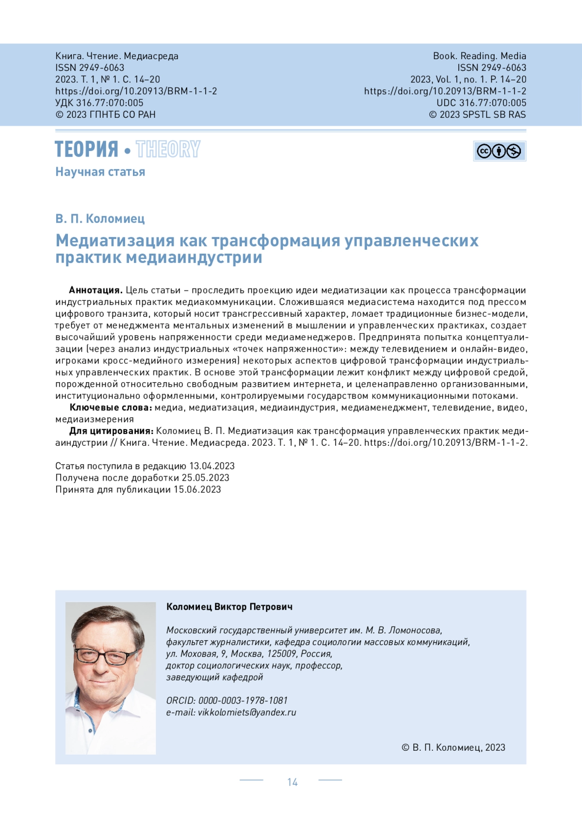 Цель статьи – проследить проекцию идеи медиатизации как процесса трансформации индустриальных практик медиакоммуникации. Сложившаяся медиасистема находится под прессом цифрового транзита, который носит трансгрессивный характер, ломает традиционные бизнес- модели, требует от менеджмента ментальных изменений в мышлении и управленческих практиках, создает высочайший уровень напряженности среди медиаменеджеров. Предпринята попытка концептуали - зации (через анализ индустриальных «точек напряженности»: между телевидением и онлайн-видео, игроками кросс- медийного измерения) некоторых аспектов цифровой трансформации индустриаль - ных управленческих практик. В основе этой трансформации лежит конфликт между цифровой средой, порожденной относительно свободным развитием интернета, и целенаправленно организованными, институционально оформленными, контролируемыми государством коммуникационными потоками.