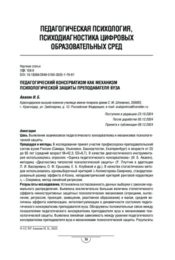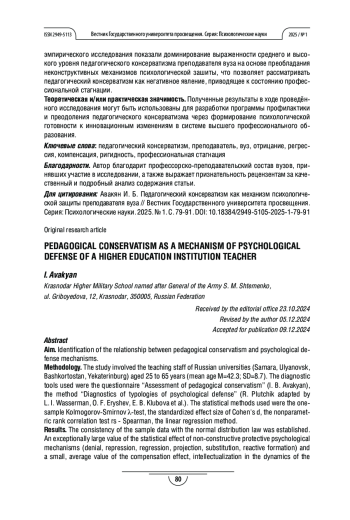 Процедура и методы. В исследовании принял участие профессорско-преподавательский состав вузов России (Самара, Ульяновск, Башкортостан, Екатеринбург) в возрасте от 25 до 65 лет (средний возраст M=42,3; SD=8,7). В качестве диагностического инструментария использовались опросник «Оценка педагогического консерватизма» (И. Б. Авакян), методика «Диагностика типологий психологической защиты» (Р. Плутчик в адаптации Л. И. Вассермана, О. Ф. Ерышева, Е. Б. Клубовой и др.). В качестве статистических методов использовались одновыборочный критерий λ-Колмогорова-Смирнова, стандартизированный размер эффекта d-Коэна, непараметрический критерий ранговой корреляции rs – Спирмена, метод линейной регрессии. Результаты исследования. Установлена согласованность данных выборки с законом нормального распределения. Выявлена исключительно большая величина статистического эффекта неконструктивных защитных психологических механизмов (отрицание, вытеснение, регрессия, проекция, замещение, реактивное образование) и малая, средняя величины эффекта компенсации, интеллектуализации в динамичности состояния педагогического консерватизма преподавателя вуза. Обнаружены положительные связи между показателями педагогического консерватизма преподавателя вуза и механизмами психологической защиты. Выявлена линейная зависимость между уровнем педагогического консерватизма преподавателя вуза и механизмами психологической защиты. Результаты эмпирического исследования показали доминирование выраженности среднего и высокого уровня педагогического консерватизма преподавателя вуза на основе преобладания неконструктивных механизмов психологической зашиты, что позволяет рассматривать педагогический консерватизм как негативное явление, приводящее к состоянию профессиональной стагнации.