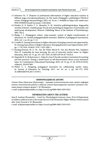13. Селезнева Ю. В. Особенности профессиональных деформаций преподавателей высшей школы на разных этапах профессионализации // Мир науки. Педагогика и психология. 2022. Т. 10 № 3. URL: https://mir-nauki.com/PDF/25PSMN322.pdf (дата обращения: 12.09.2024).