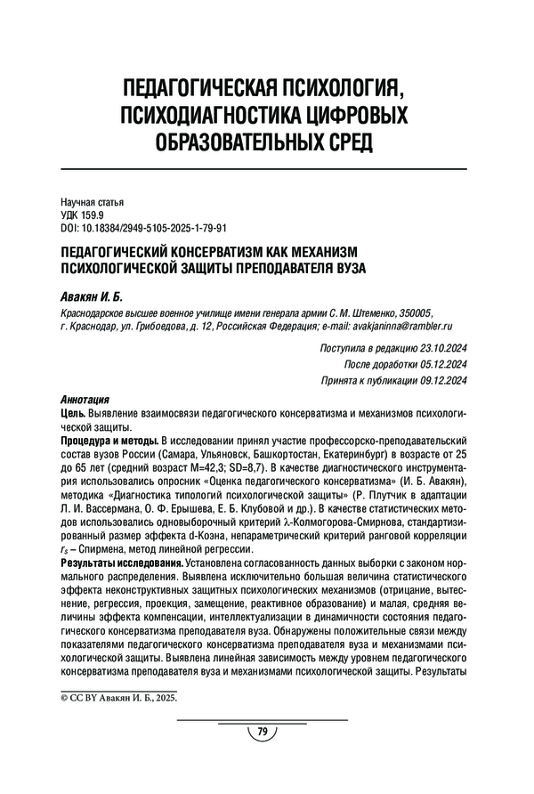 1. Авакян И. Б. Педагогический консерватизм преподавателей вуза // Известие Саратовского университета. Новая серия. Серия: Акмеология образования. Психология развития. 2024. Т. 13. № 1 (49). С. 80-90. https://doi.org/10.18500/2304-9790-202413-1-80-90.