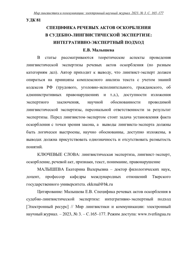 В статье рассматриваются теоретические аспекты проведения лингвистической экспертизы речевых актов оскорбления (по разным категориям дел). Автор приходит к выводу, что лингвист-эксперт должен опираться на принципы комплексного анализа текста с учетом знаний кодексов РФ (трудового, уголовно-исполнительного, гражданского, об административных правонарушениях и т. д.), доступности изложения экспертного заключения, научной обоснованности проводимой лингвистической экспертизы, персональной ответственности за результат экспертизы. Перед лингвистом-экспертом стоит задача установления факта оскорбления с точки зрения закона, а выводы лингвиста-эксперта должны быть логически выстроены, научно обоснованны, доступно изложены, в выводах должна присутствовать однозначность и отсутствовать размытость понятий.