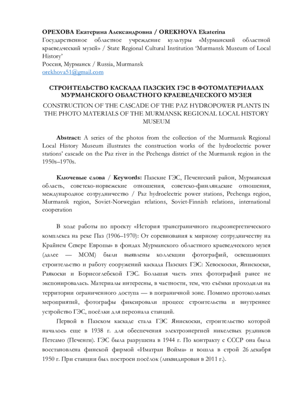ОРЕХОВА Е. А. СТРОИТЕЛЬСТВО КАСКАДА ПАЗСКИХ ГЭС В ФОТОМАТЕРИАЛАХ МУРМАНСКОГО ОБЛАСТНОГО КРАЕВЕДЧЕСКОГО МУЗЕЯ // АЛЬМАНАХ СЕВЕРОЕВРОПЕЙСКИХ И БАЛТИЙСКИХ ИССЛЕДОВАНИЙ. 2022. № 7