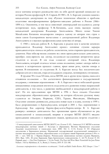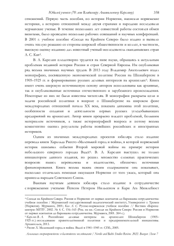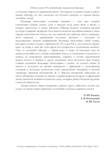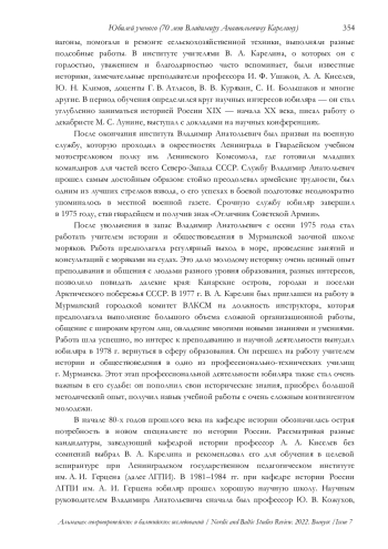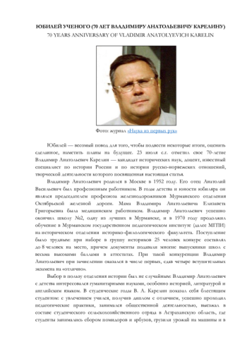 Фото: журнал «Наука из первых рук» Юбилей -весомый повод для того, чтобы подвести некоторые итоги, оценить сделанное, наметить планы на будущее.23 июля с. г. отметил свое 70-летие Владимир Анатольевич Карелин -кандидат исторических наук, доцент, известный специалист по истории России и по истории русско-норвежских отношений, творческой деятельности которого посвященная настоящая статья. Владимир Анатольевич родился в Москве в 1952 году. Его отец Анатолий Васильевич был профсоюзным работником. В годы детства и юности юбиляра он являлся председателем профсоюза железнодорожников Мурманского отделения Октябрьской железной дороги. Мама Владимира Анатольевича Елизавета Григорьевна была медицинским работником. Владимир Анатольевич успешно окончил школу №2, одну из лучших в Мурманске, и в 1970 году продолжил обучение в Мурманском государственном педагогическом институте (далее МГПИ) на историческом отделении историко-филологического факультета. Поступление было трудным: при наборе в группу историков 25 человек конкурс составлял до 8 человек на место, причем документы подавали многие выпускники школ с весьма высокими баллами в аттестатах. При такой конкуренции Владимир Анатольевич при зачислении оказался в числе первых, сдав четыре вступительных экзамена на «отлично». Выбор в пользу отделения истории был не случайным: Владимир Анатольевич с детства интересовался гуманитарными науками, особенно историей, литературой и английским языком. В студенческие годы В. А. Карелин показал себя блестящим студентом: с увлечением учился, получив диплом с отличием, успешно проходил педагогические практики, занимался общественной деятельностью, выезжал в составе студенческого сельскохозяйственного отряда в Астраханскую область, где студенты занимались сбором помидоров
