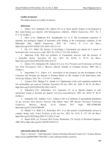 4. Аккерман А.Ш. Проблематика гидродинамических исследований сеноманских скважин в условиях наличия проницаемой перемычки // Экспозиция Нефть Газ. 2023. № 8(101). С. 70–74. https://doi.org/10.24412/2076-6785-2023-8-70-74