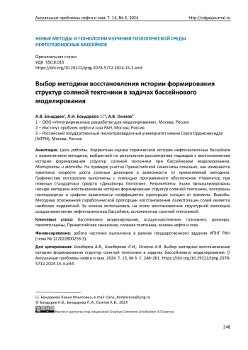 Цель работы. Корректная оценка термической истории нефтегазоносных бассейнов с применением методики, выбранной по результатам рассмотрения подходов к восстановлению истории формирования структур соляной тектоники при бассейновом моделировании. Материалы и методы. На примере участка Прикаспийской синеклизы показано, как изменяется трактовка скорости роста соляных диапиров в зависимости от применяемой методики. Графические построения выполнены с помощью программного обеспечения тНавигатор при помощи стандартных средств «Дизайнера Геологии». Результаты. Были проанализированы четыре методики восстановления истории формирования структур соляной тектоники, построены палеоразрезы и графики зависимости коэффициента пропорции толщин от времени. Выводы. Методика отложенной параболической пропорции восстановления палеотолщин солей является наиболее корректной. Ее можно использовать на этапе восстановления структурной эволюции осадконакопления нефтегазоносных бассейнов, осложненных соляной тектоникой.