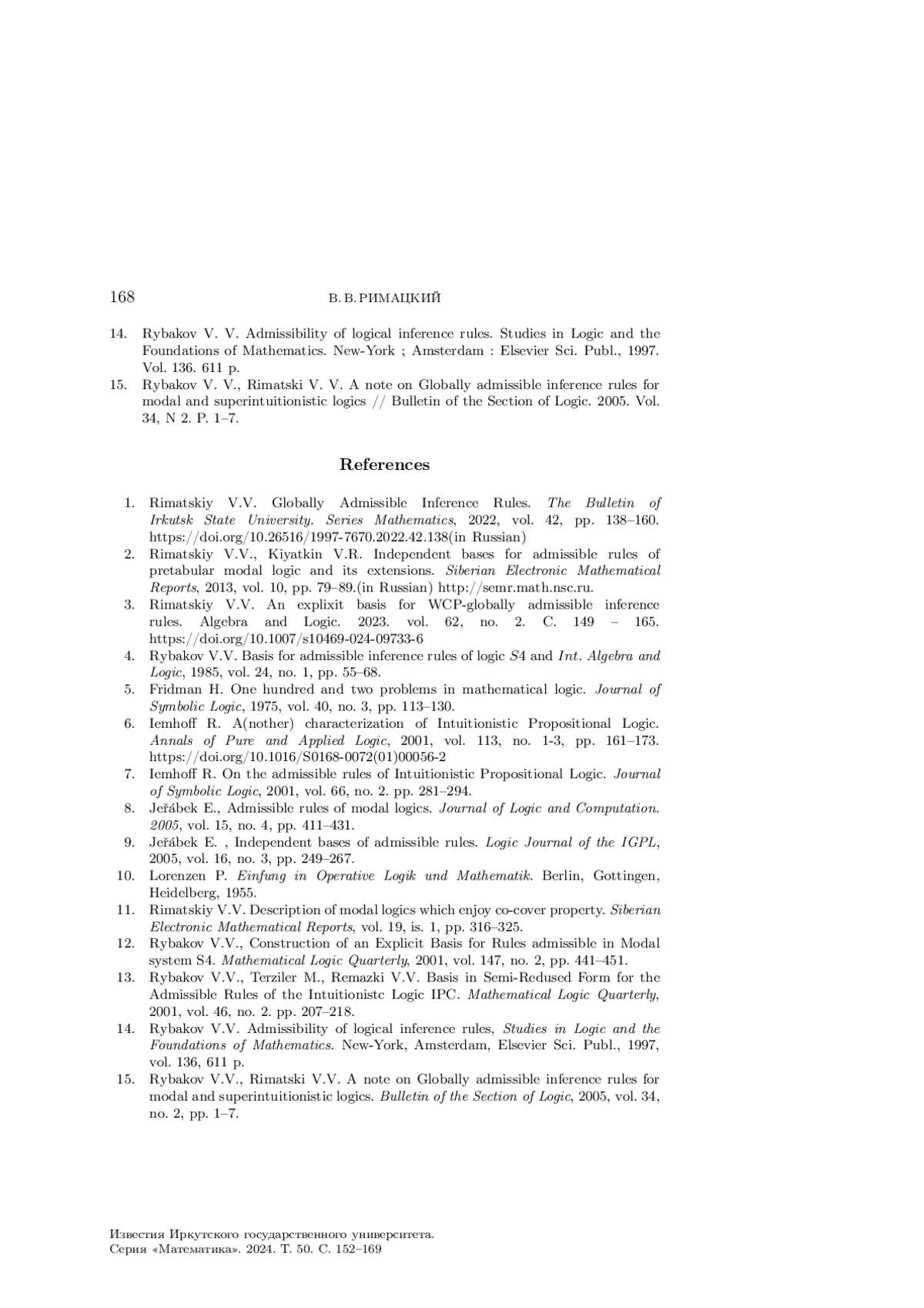 1. Rimatskiy V.V. Globally Admissible Inference Rules. The Bulletin of Irkutsk State University. Series Mathematics, 2022, vol. 42, pp. 138-160. 10.26516/1997-7670.2022.42.138(in Russian). DOI: 10.26516/1997-7670.2022.42.138(inRussian) EDN: DHIOLQ