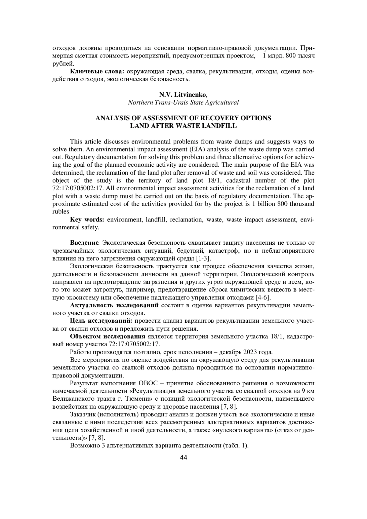 ЛИТВИНЕНКО Н. В. АНАЛИЗ ОЦЕНКИ ВАРИАНТОВ РЕКУЛЬТИВАЦИИ ЗЕМЕЛЬНОГО УЧАСТКА ПОСЛЕ СВАЛКИ ОТХОДОВ // МИР ИННОВАЦИЙ. 2023. № 4 (27)