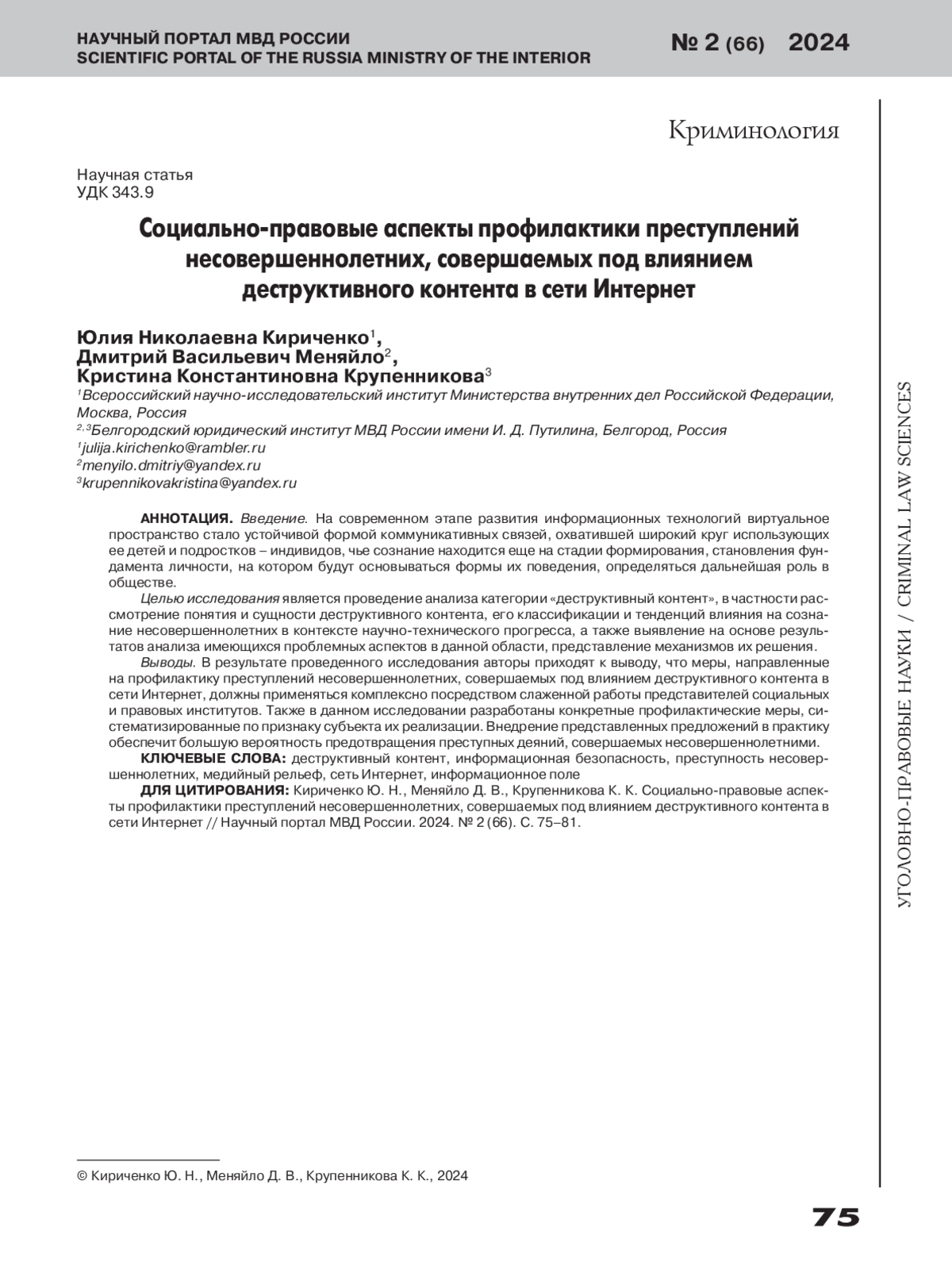 Выводы. В результате проведенного исследования авторы приходят к выводу, что меры, направленные на профилактику преступлений несовершеннолетних, совершаемых под влиянием деструктивного контента в сети Интернет, должны применяться комплексно посредством слаженной работы представителей социальных и правовых институтов. Также в данном исследовании разработаны конкретные профилактические меры, систематизированные по признаку субъекта их реализации. Внедрение представленных предложений в практику обеспечит большую вероятность предотвращения преступных деяний, совершаемых несовершеннолетними.