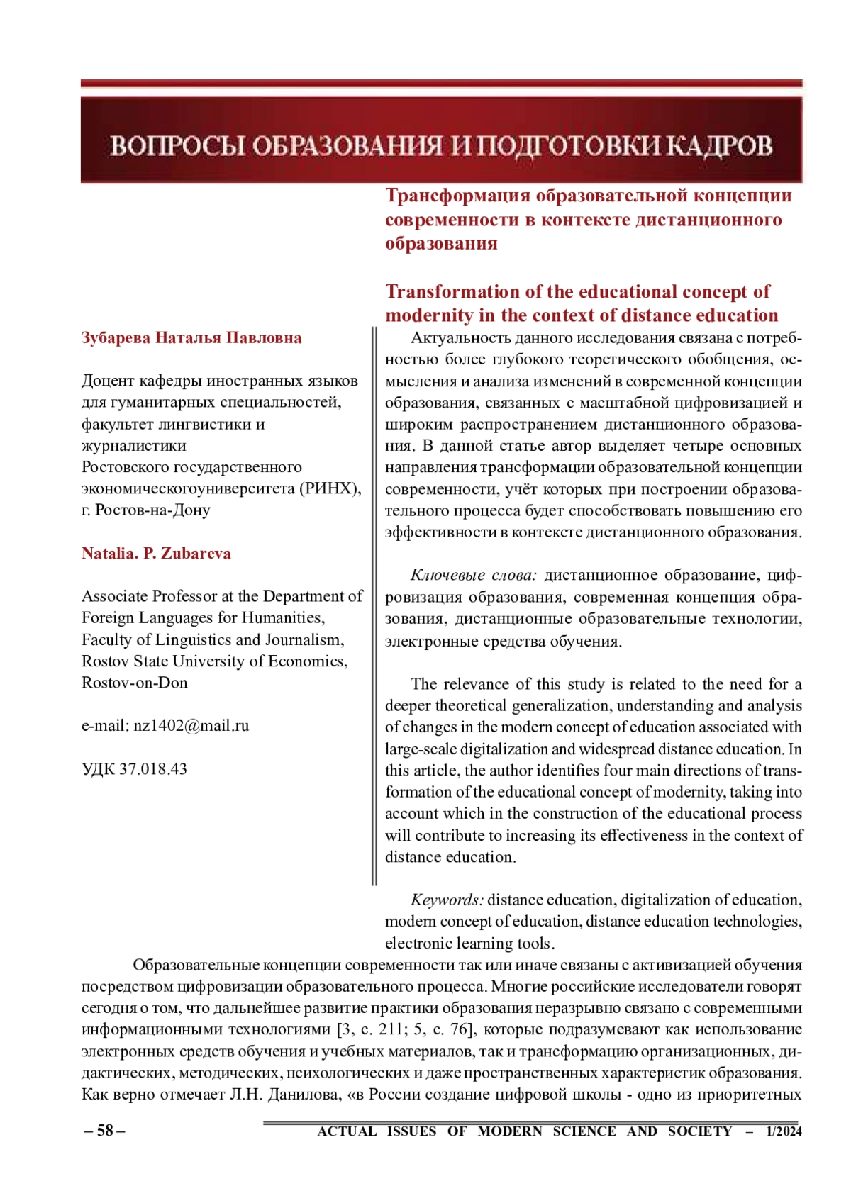 Актуальность данного исследования связана с потребностью более глубокого теоретического обобщения, осмысления и анализа изменений в современной концепции образования, связанных с масштабной цифровизацией и широким распространением дистанционного образования. В данной статье автор выделяет четыре основных направления трансформации образовательной концепции современности, учёт которых при построении образовательного процесса будет способствовать повышению его эффективности в контексте дистанционного образования.