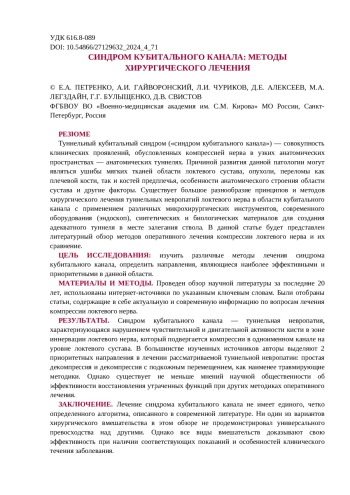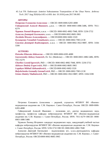 39. Чуриков Л.И., Гайворонский А.И., Алексеев Д.Е., и др. Сравнение результатов хирургического лечения туннельных невропатий локтевого нерва в области кубитального канала // Давиденковские чтения. 2021. С. 371–372.