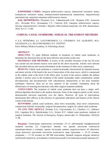 11. Ханнанова И.Г., Галлямов А.Р., Богов А.А., Журавлев М.Р. Синдром кубитального канала. Литературный обзор // Практическая медицина. 2017. № 8. С. 164–167.
