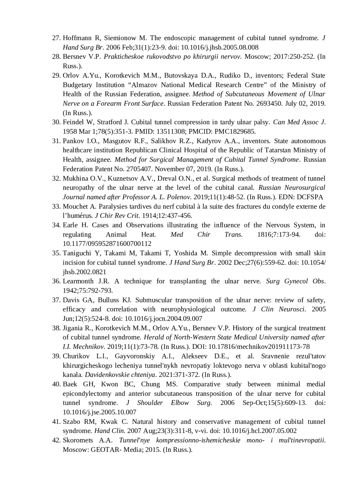 38. Джигания Р., Короткевич М.М., Орлов А.Ю., Берснев В.П. История развития хирургии невропатии локтевого нерва на уровне кубитального канала // Вестник Северо-Западного государственного медицинского университета им. И.И. Мечникова. 2019. Т. 11, № 1. С. 73–78. EDN: SOPFUY